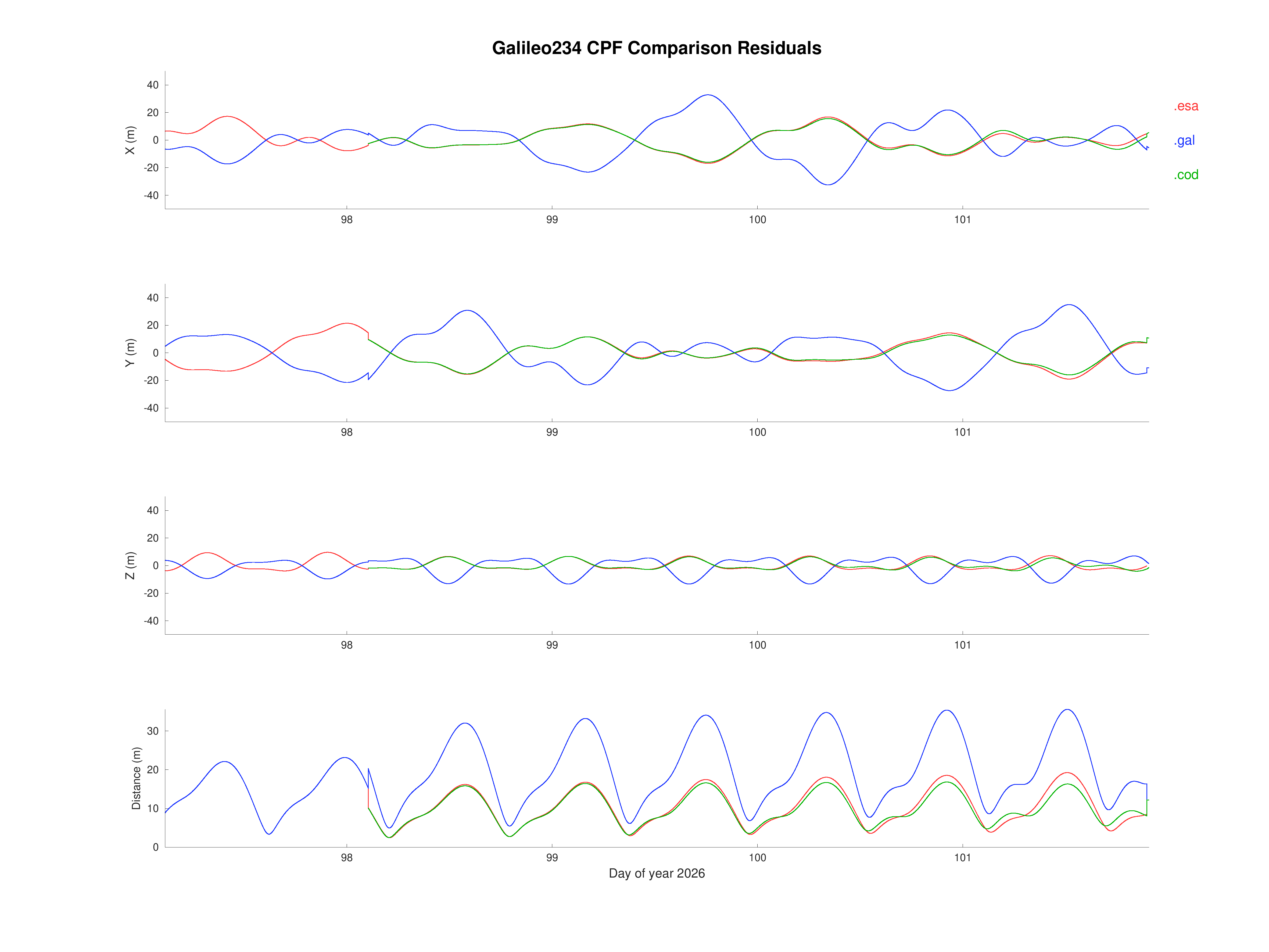 The residual plots below show the geocentric X, Y, and Z and separation distance for all satellites supported by the ILRS. Residuals are plotted against a running mean of the 2 or more predictions available. The XYZ y-axis limits are set to 10m, 50m, 200m or automatically scaled depending on their magnitude. The plots are updated each day.